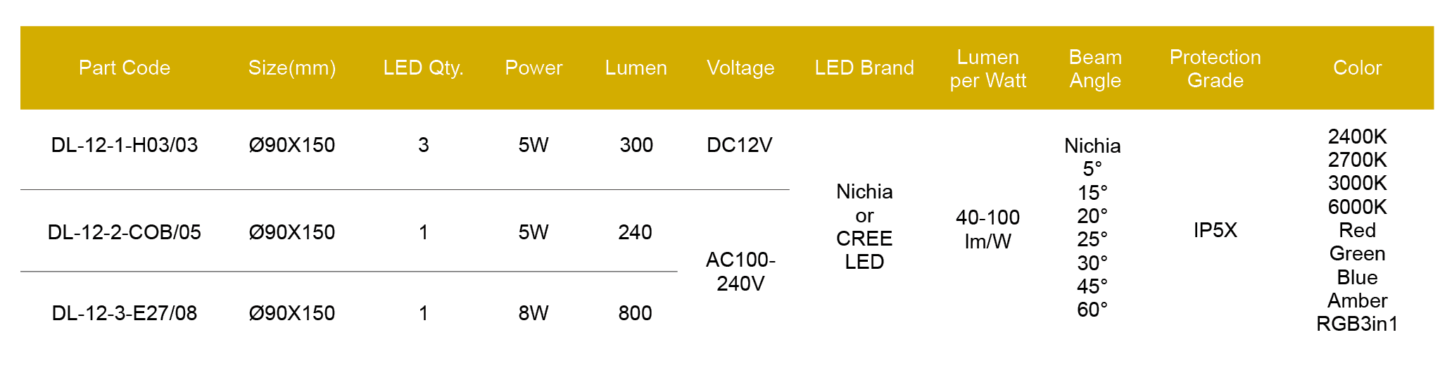 Nichia/Cree or made in Taiwan LED, CRI > 80