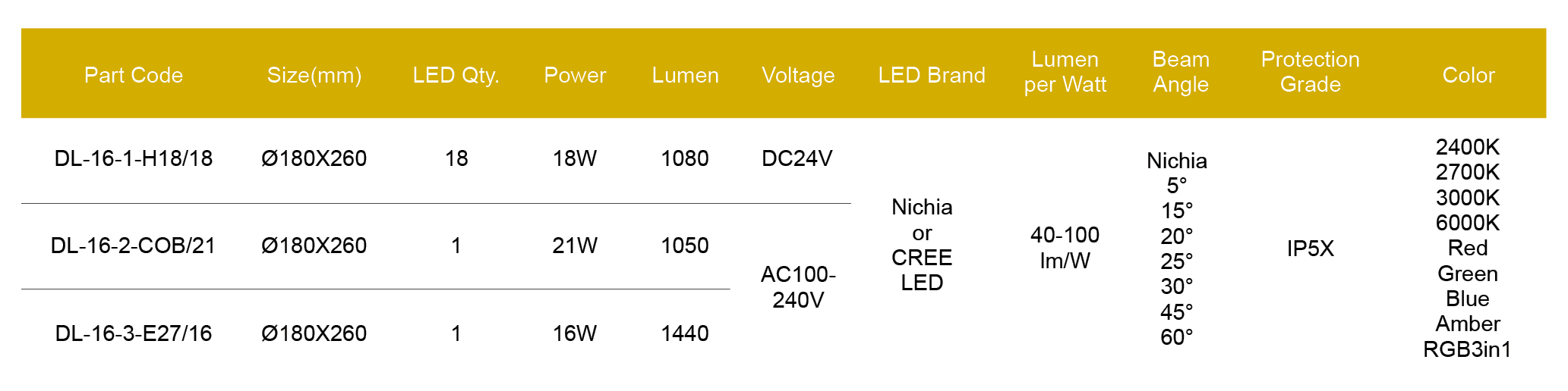 Nichia/Cree or made in Taiwan LED, CRI > 80