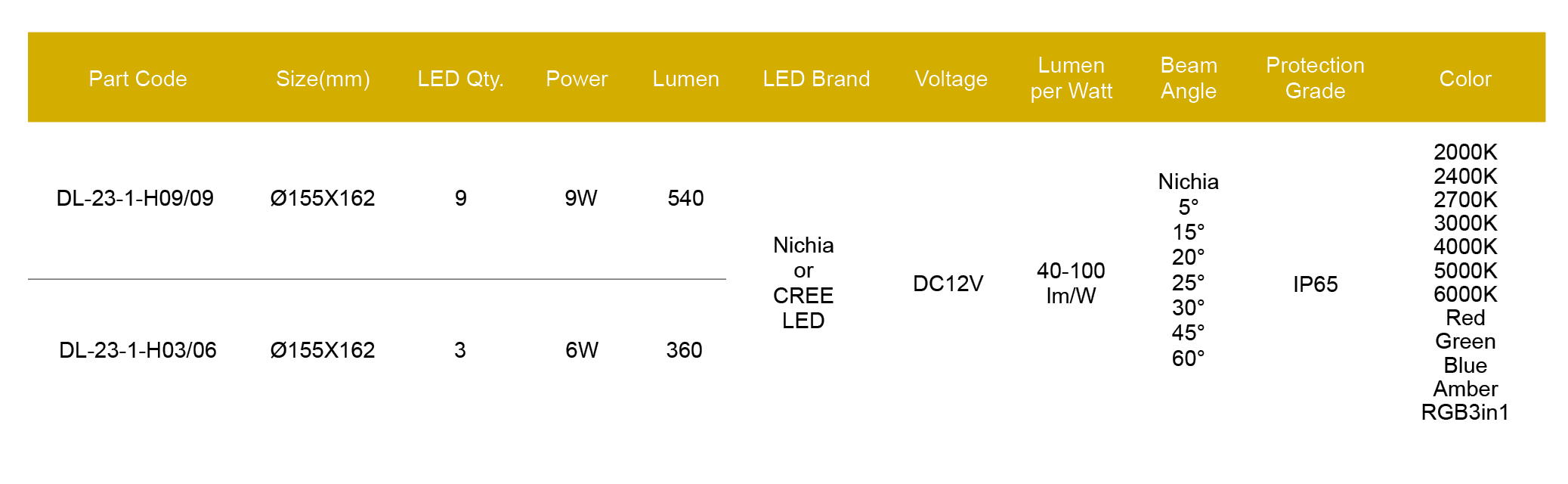 Nichia/Cree or made in Taiwan LED, CRI > 80