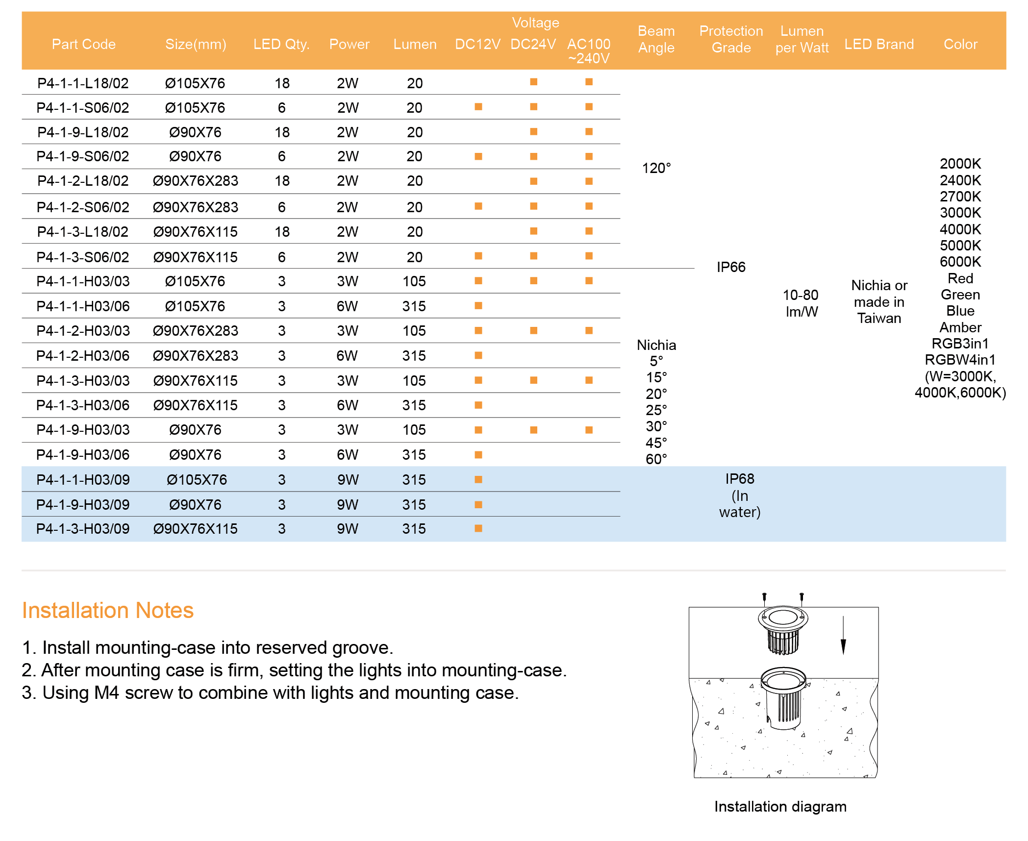 Nichia or Cree high power LED, CRI > 80