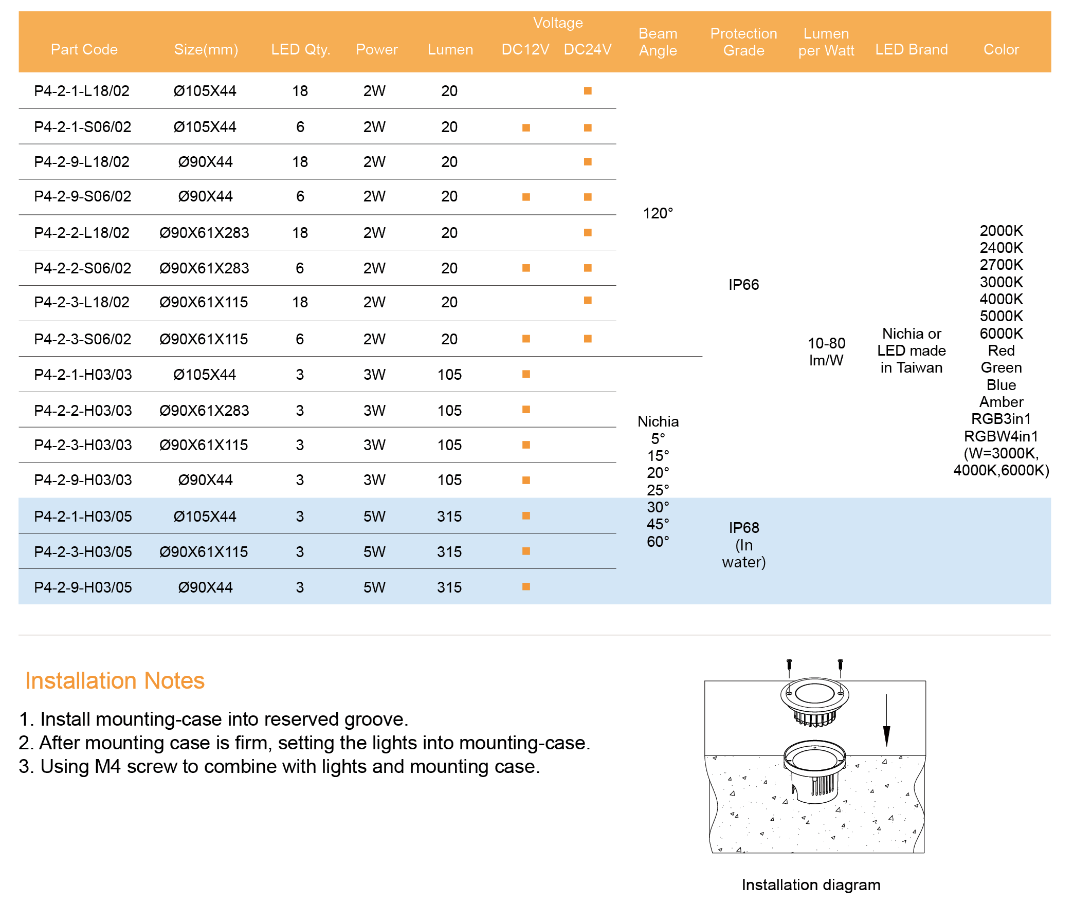 Nichia/Cree or made in Taiwan LED, CRI > 80