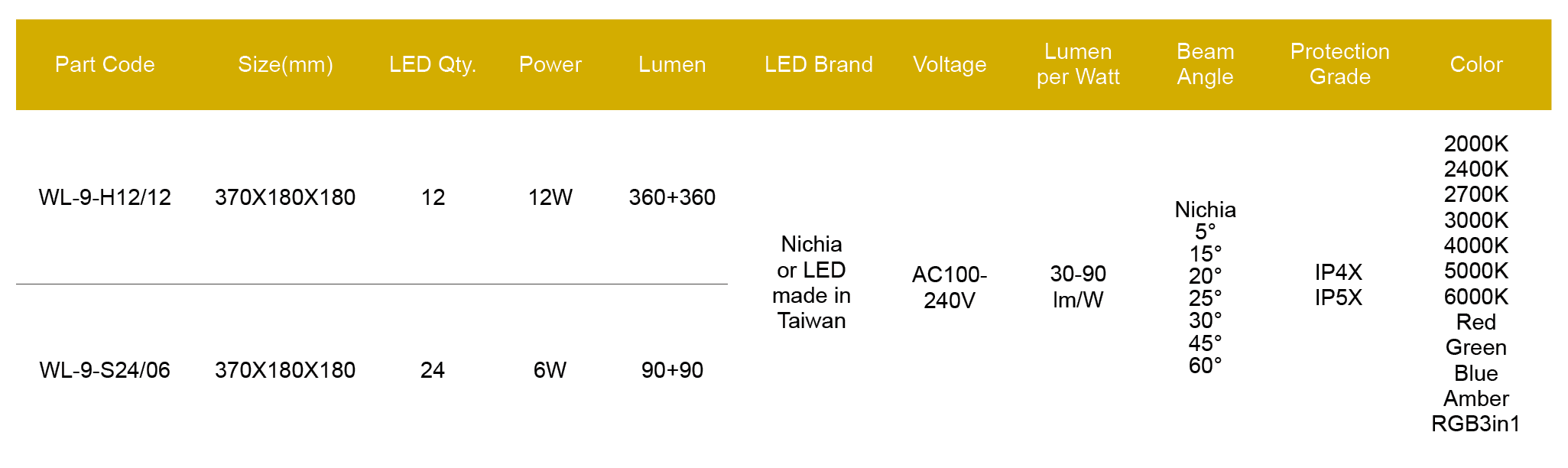 Nichia/Cree or made in Taiwan LED, CRI > 80