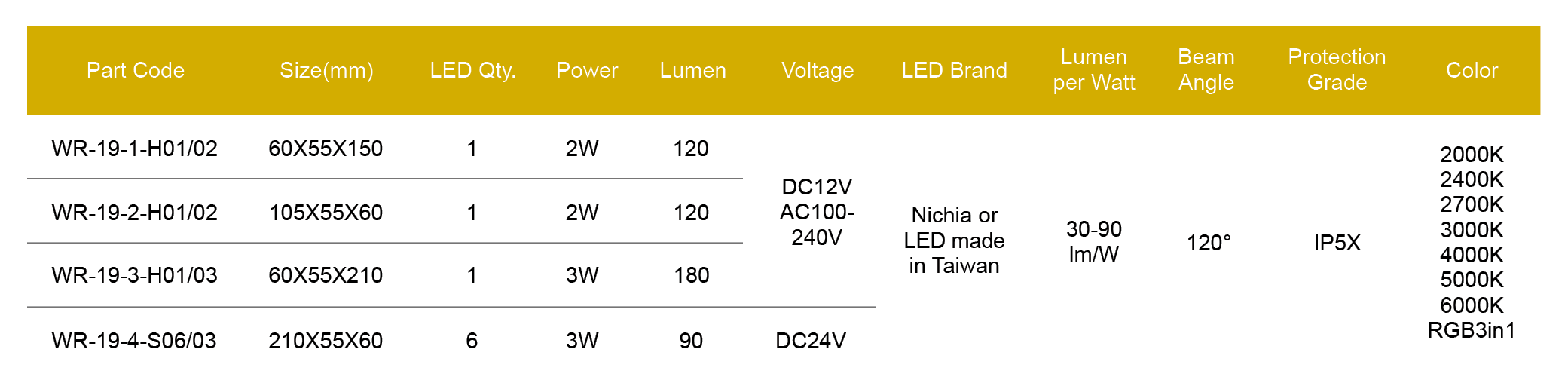 Max. Power: 2W(WR-19-1)/2W(WR-19-2)/3W(WR-19-3)/3W(WR-19-4)