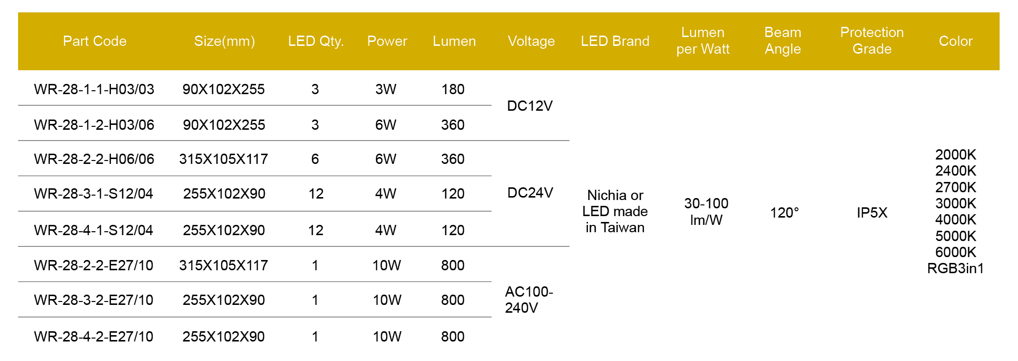 Nichia/Cree or made in Taiwan LED, CRI > 80