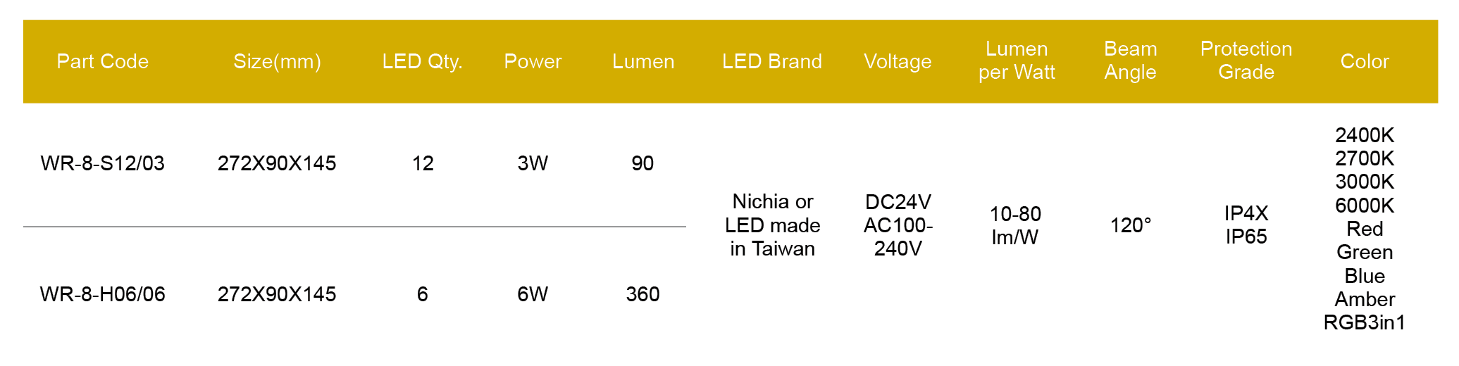 Nichia/Cree or made in Taiwan LED, CRI > 80