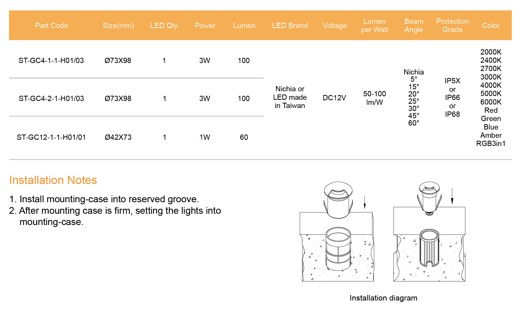 Max. power: 3W(ST-GC4-1-1) / 1W(ST-GC12-1-1)